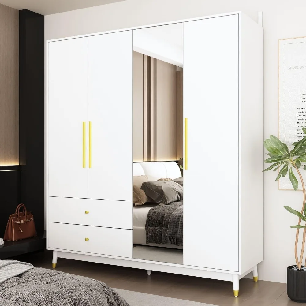 4-Door Wardrobe with Mirror & 2 Drawers, Armoire Wardrobe Closet with 2 Hanging Rods, Armoire Closet with Wooden Legs, Closet