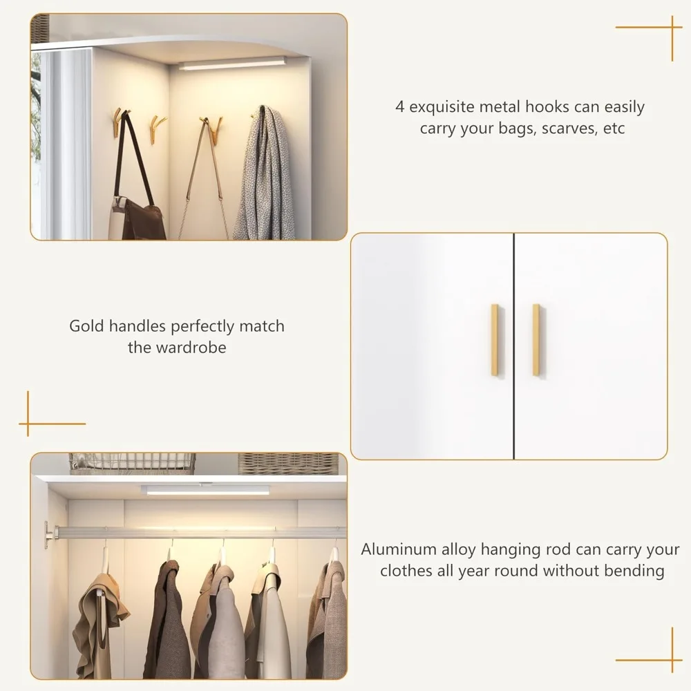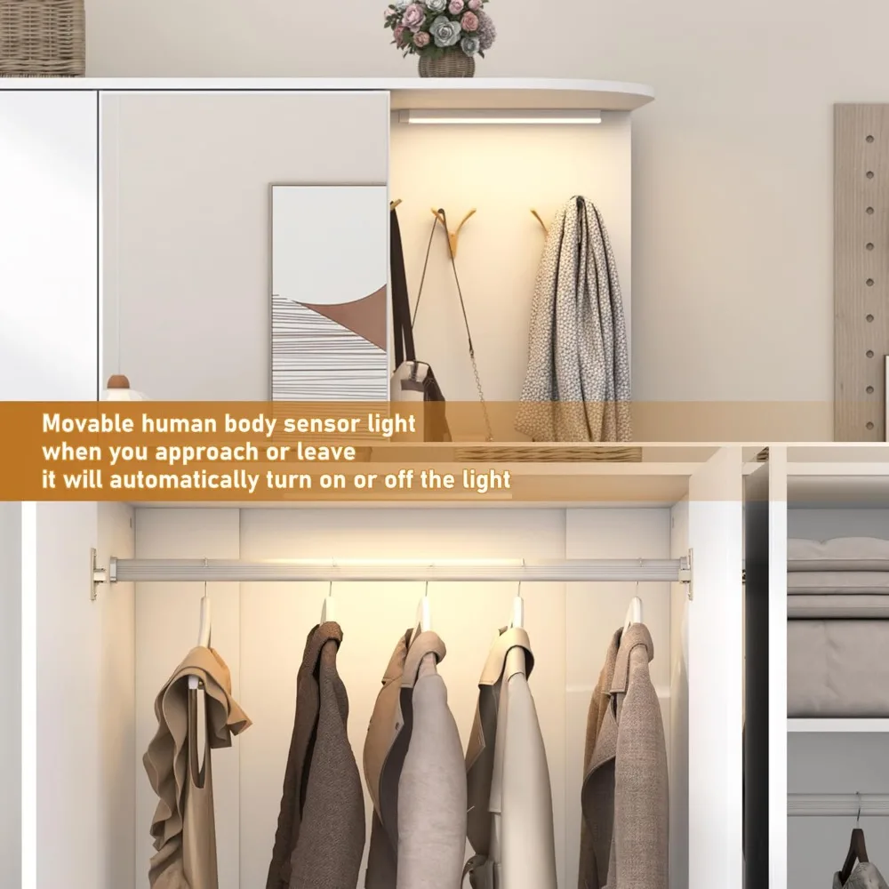 - Body Sensor Light: Our large white wardrobe closet are equipped with rechargeable sensor lights, which have 3 modes: constant light, flashing and human body sensing mode. They can be installed in corner space or inside wardrobes to add a warm atmosphere to the room.